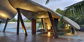 Nature is always able to inspire the world of architecture . This time , turn the leaves form used by SJK Architects of India to create a unique residence in the coastal areas Alibaug , India . Used as a form of leaf canopy . Each canopy supported by pillars slanted steel is made to shade a particular space .