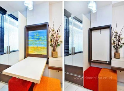 try to bring a dining table and chairs that can be folded , it looks simple , but it is a more effective way to make the room seem flexible . dining table when not in use can be used as a clothes iron . eg the use of materials that are not the same furniture , as seen in the living room with teak wood , while the dining room with ramin wood was not an issue .